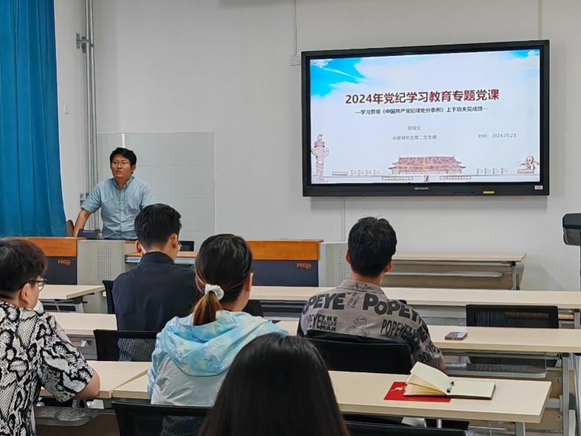 为进一步强化党员的纪律意识、加强自我约束、提高免疫能力,增强政治定力、纪律定力、道德定力、抵腐定力,5月23日,水资研究生第二党支部2024年党纪学习教育专题党课在亚洲在线 D305室开展,党支部全体党员参与,党支部书记栗现文老师主持。