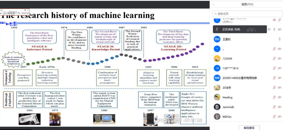 刘老师详细开展案例教学,进一步夯实同学们基础理解。科技前沿的带入引起了大家热烈的回响,自动驾驶等相关技术的介绍更是将整个报告推向高潮。问题教学法带领在线师生积极思考,“什么是机器学习?”、“机器学习的原理是什么?”、“如何进行机器学习?”、“机器学习可以应用在哪些方面?”等一系列问题的提出,从侧面提高了师生学习效果。“授人以鱼不如授人以渔”,刘老师从资料查询、文章撰写、升学、工作就业等各个方面为大家解释了机器学习的相关信息。