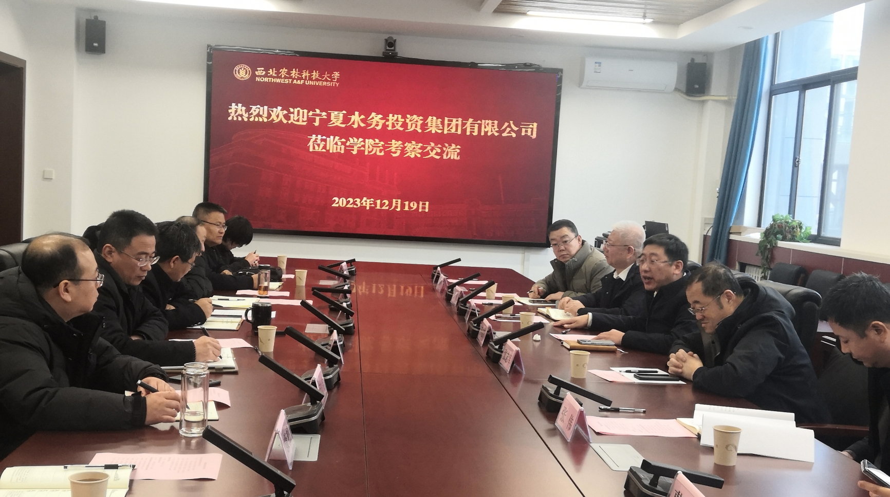 12月19日上午,宁夏水务投资集团有限公司党委书记、董事长李志军一行5人来院就院企合作事宜进行座谈交流。胡笑涛院长主持会议,樊恒辉副院长、张鑫副院长、胡明铭副院长、水资系主任康艳、智慧水利系主任张智韬、杨凌水务局局长贺群、杨凌自来水公司总经理曹轩等参加座谈会。