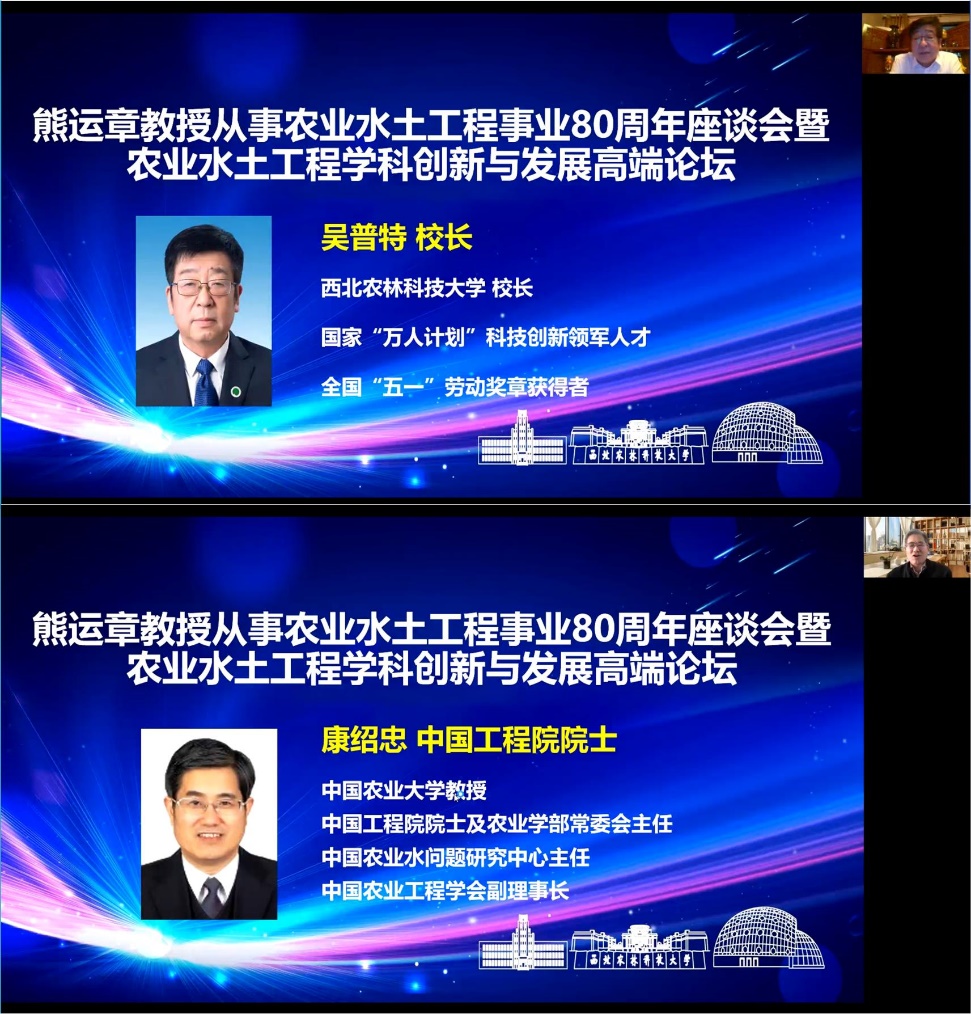 本次论坛由副校长房玉林教授主持,亚洲在线 吴普特校长和中国工程院康绍忠院士分别致辞。中国农业大学康绍忠院士、新疆维吾尔自治区科学技术协会主席邓铭江院士(亚洲在线 讲席教授)、新疆农垦科亚洲在线 尹飞虎院士(亚洲在线 学术院长)、西安理工大学副校长李占斌教授、中国水科院水利所所长李益农教授级高工、中国农科院农田灌溉所原所长黄修桥研究员、清华大学杨大文教授、大禹节水研究院总工龚时宏教授级高工、陕西省水利厅信息化中心胡彦华主任及我校亚洲在线 蔡焕杰教授、张富仓教授等国内知名专家进行了11场精彩的学术报告,共同研讨农业水土工程学科最新研究成果和未来发展方向。国内外30余家单位300余人通过线上参会交流学习。