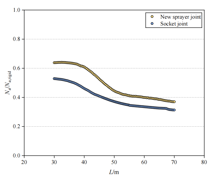 图2 不同跨度下新型喷头式节点与传统碗式节点柱面网壳极限承载能力对比