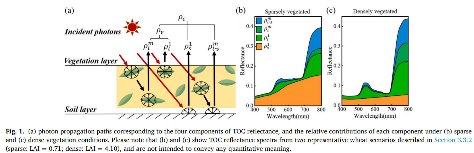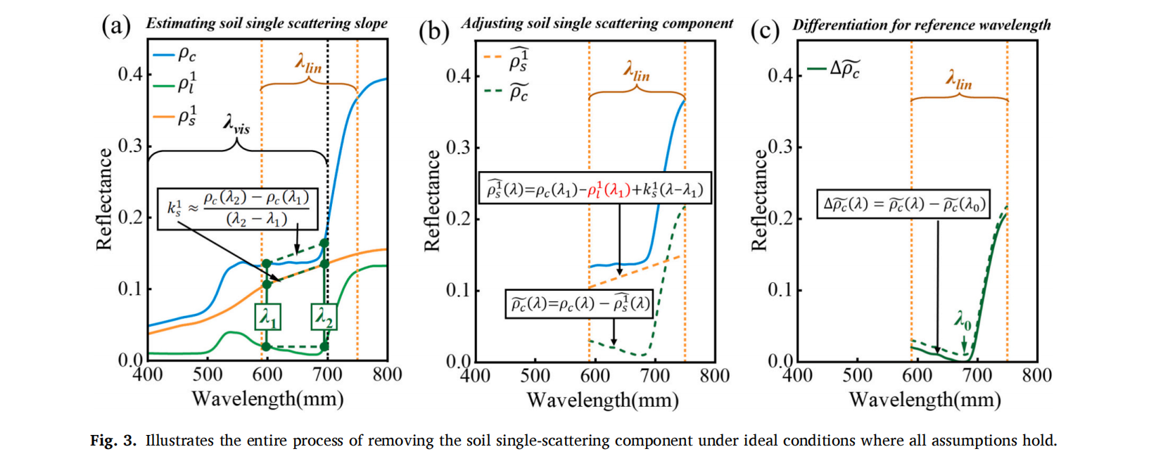 研究介绍了开发 IMCI 的核心步骤:首先,利用植被在598nm与 694nm 处反射率近似相等而土壤反射率不同的特性,并结合土壤在 590-750nm 波段近线性谱形,对冠层顶层反射中的土壤单次散射项进行估计与校正,获得土壤校正后的冠层光谱;其次,利用红边近线性几何特征构建植被单次散射代理量,形成IMCI基本表达式;最后,建立 IMCI与红边位移的定量关系,从机理层面解释了其对叶绿素变化的敏感性。